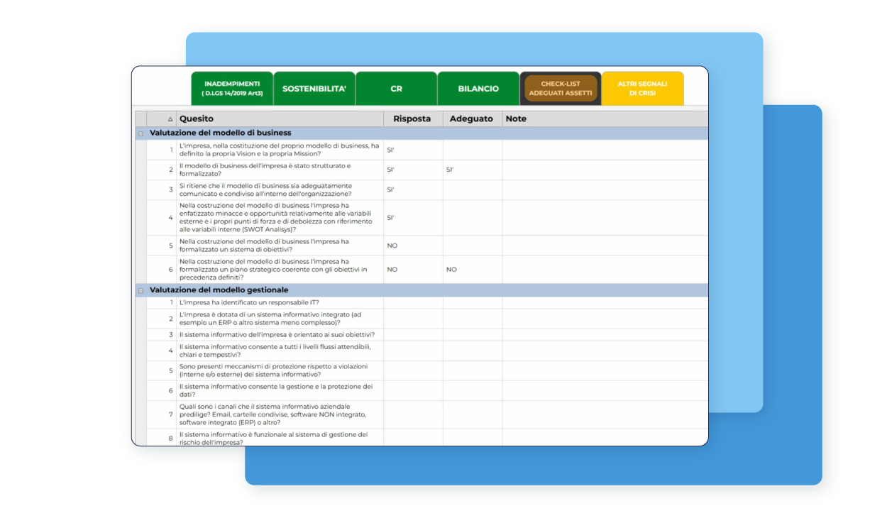 È fondamentale quindi per il professionista munirsi di uno strumento che agevoli l'attività di monitoraggio e prevenzione, permettendo di rilevare per tempo e in modo semplice e veloce l’eventuale presenza di segnali di crisi dell’impresa cliente.